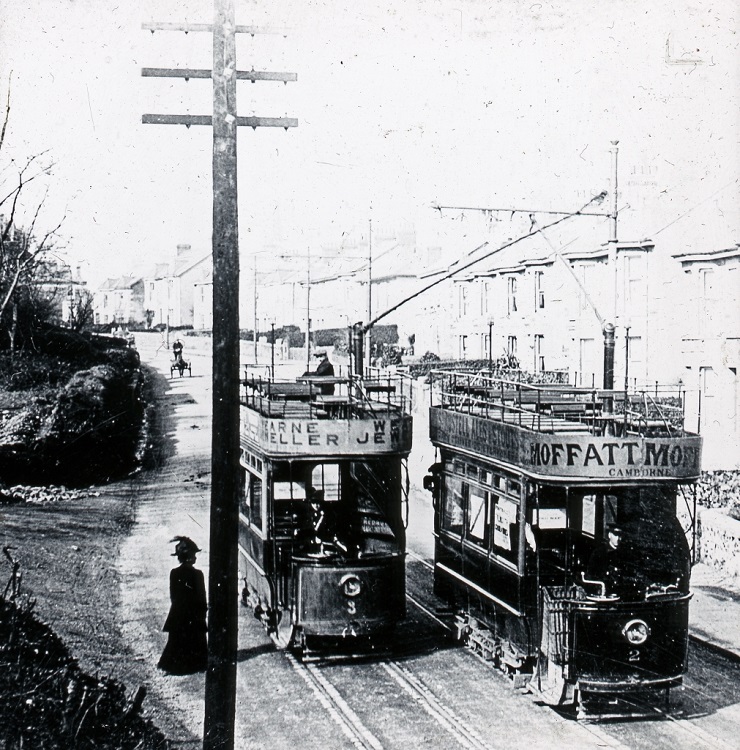 Trams from the Camborne-Redruth service passing in Barncoose near Redruth. The service began in 1902 and ceased in 1934. Moffatt advertised on the tram was a chemist in Camborne