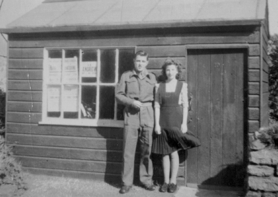 Jean and Cyril standing in the doorway of the shoe repair shop