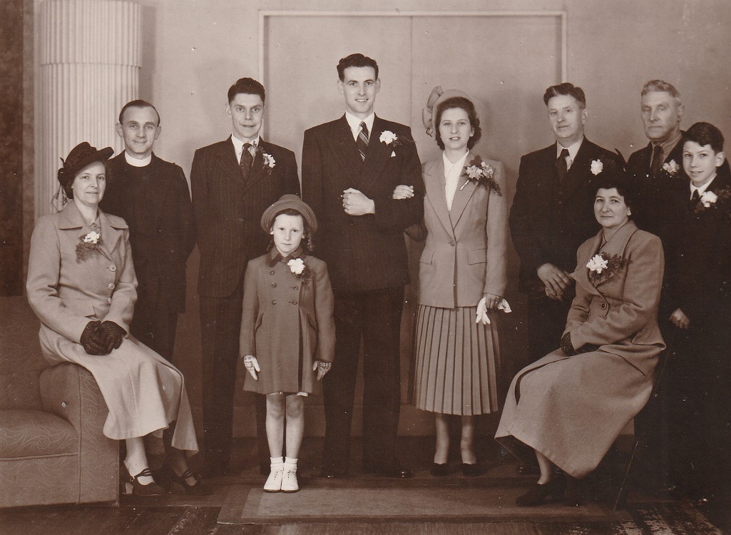 From left to right: Lilian (Leslie's mother), Rev. Simpson, Hedley (Best man), Rosemary (Leslie's sister), Leslie, Jean, Arthur Sr., Rose, John (Leslie's grandfather), David