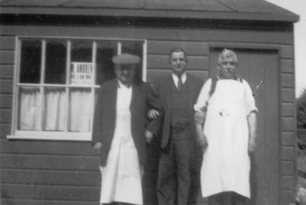 Jean's uncle, great uncle and grandfather standing outside the shoe repair shop