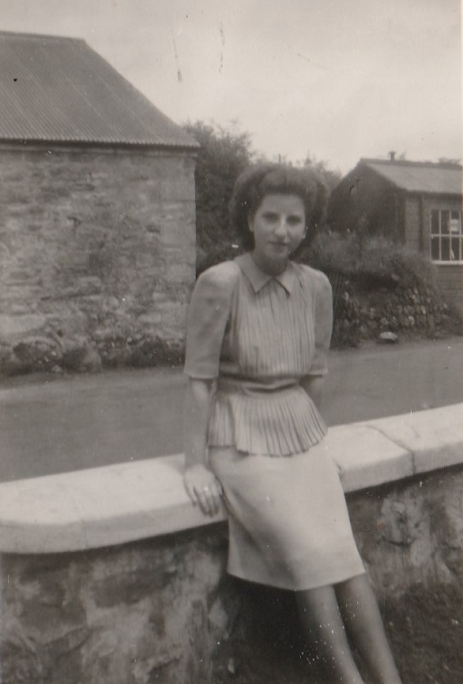 Sitting on the front wall of 13 Church Road, Pool: July 1948