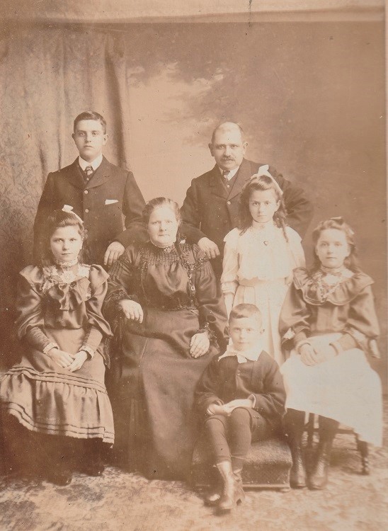 From left to right: Florence, Joe, Harriet, Martin, Kate, Hettie. Arthur sitting on stool