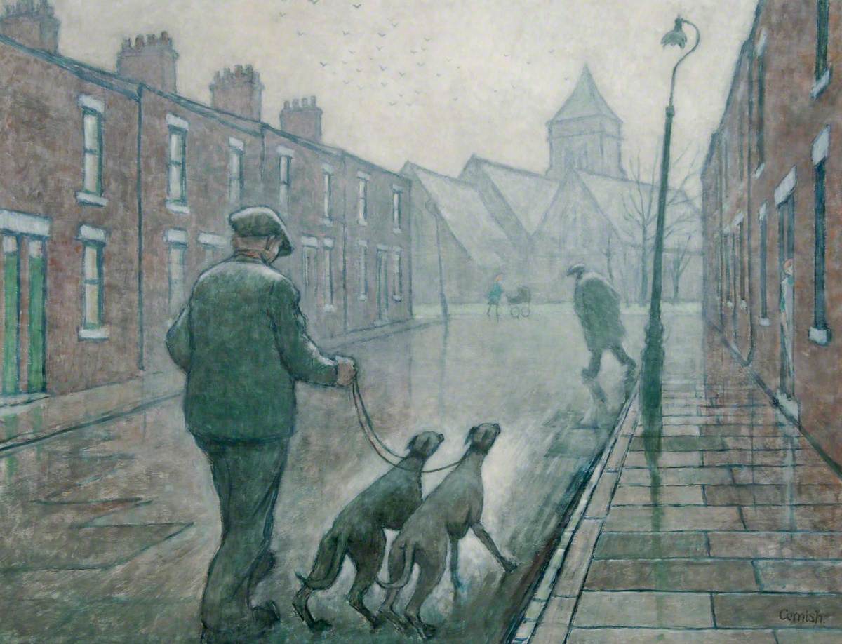Norman Cornish (1919-2014) Edward Street, Man Walking Dogs. Northumbria University Gallery, Newcastle
