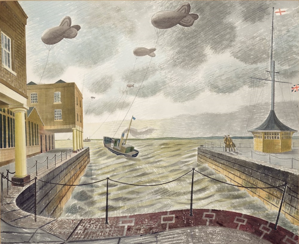 Eric Ravilious (1903-42): Barrage Balloons Outside a British Port (Undated). Leeds Art Gallery