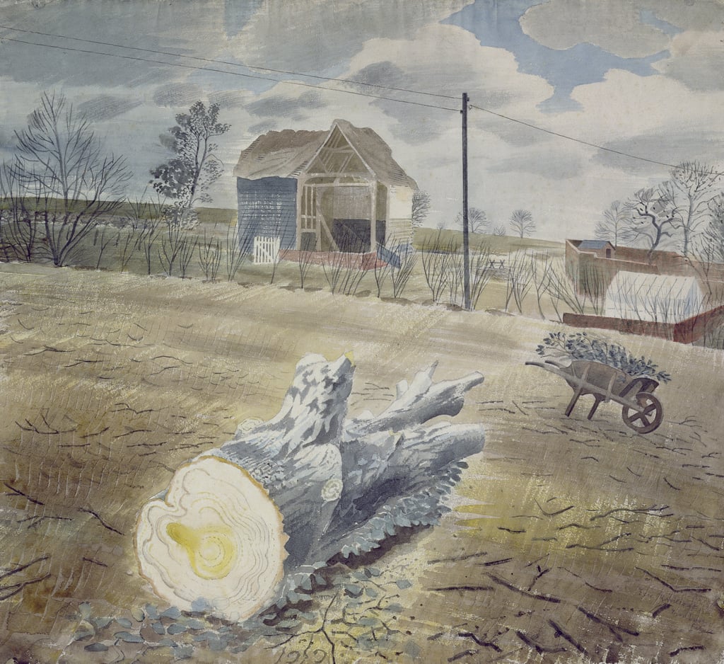 Eric Ravilious (1903-42): Tree Trunks and Wheelbarrow (Undated). Private collection
