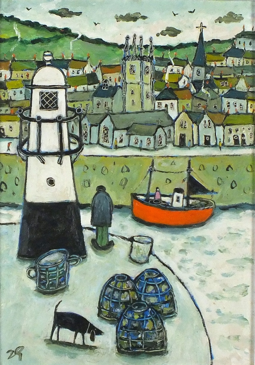Joan Gillchrest (1918-2008): Man and his Dog by Lobster Pots - Smeatons Pier, St. Ives (Undated). Private collection
