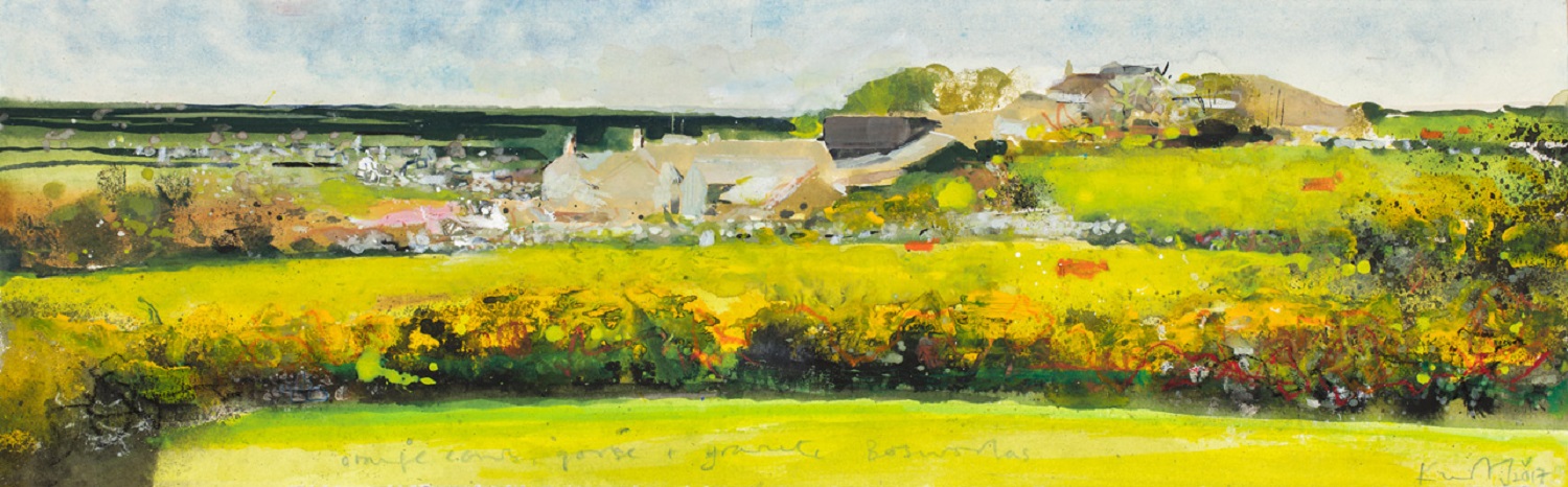 Kurt Jackson (1961-): Orange cows, gorse and granite Bosworlas (2017). Private collection