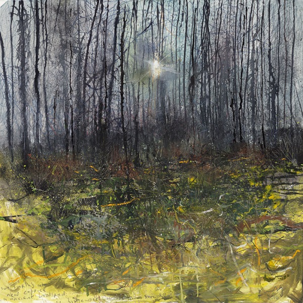 Kurt Jackson (1961-): Sun sinking into new coppice in ancient woodland (2016). Private collection