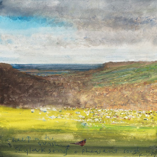 Kurt Jackson (1961-): Sheep in the sunshine, skylark song and pheasant cough (2016). Private collection