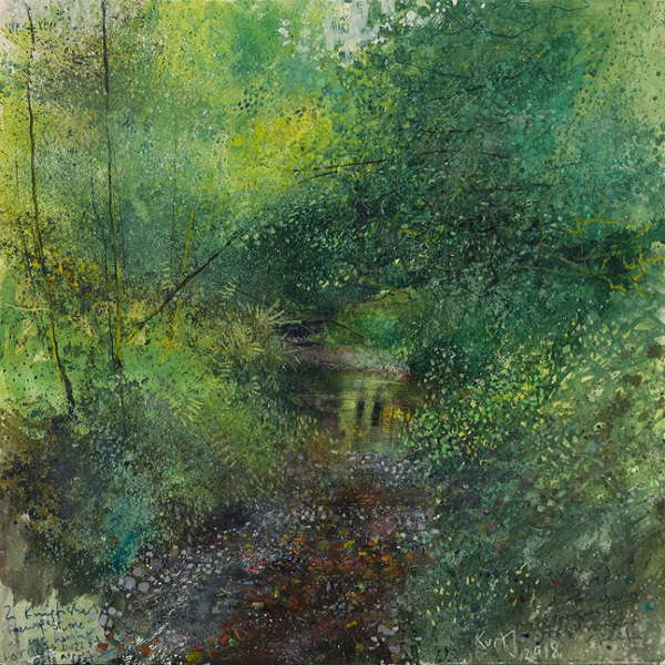 Kurt Jackson (1961-): Two kingfishers fly pass me, hornets buzz by, eels at my feet (2018). Private collection