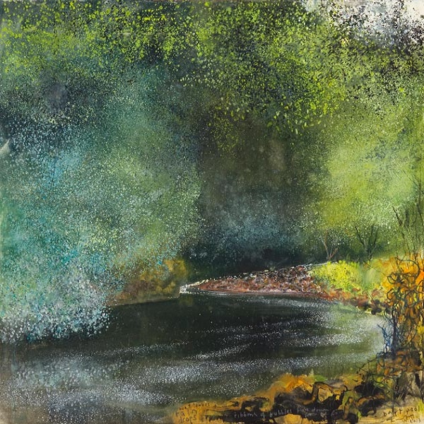 Kurt Jackson (1961-): Dart pool. Ribbons of bubbles flow down from the falls. Wet leaves and raindrops (2013)