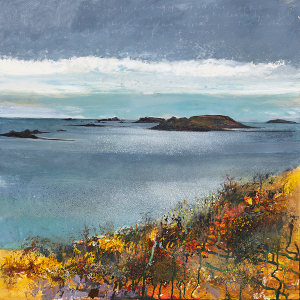 Kurt Jackson (1961-): The seals are singing out on the rocks, a heron is being chased by a gull (2018)