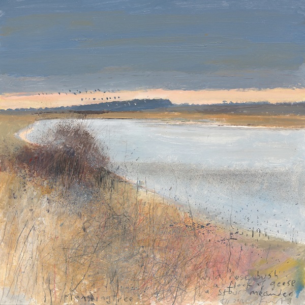 Kurt Jackson (1961-): Manningtree, a wild rose bush, a flock of geese, a Stour meander (2016). Private collection