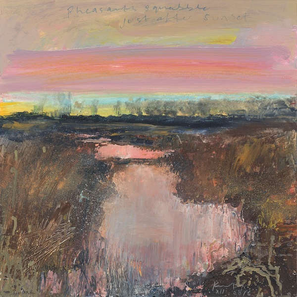 Kurt Jackson (1961-): Pheasants squabble just after sunset (2016). Private collection