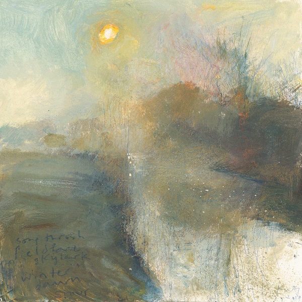Kurt Jackson (1961-): Song thrush, fieldfare,skylark, winter dawn Stour (2019). Private collection