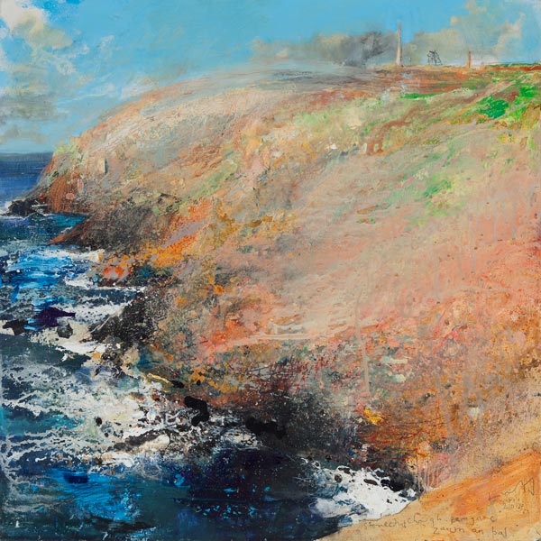 Kurt Jackson (1961-): Stonechat, chough, peregrine. Zawn a Bal (2014). Private collection