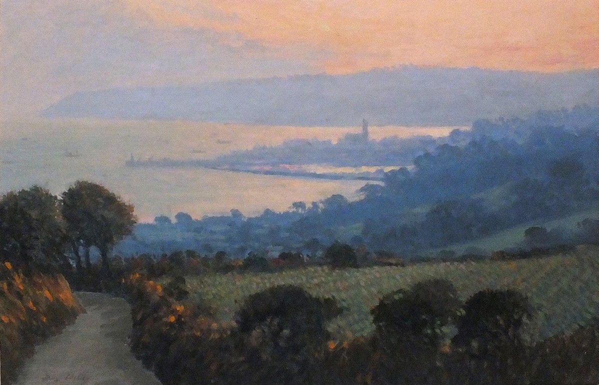 John Miller (1931-2002): St Mary's Church, Penzance from above Gulval (1987)