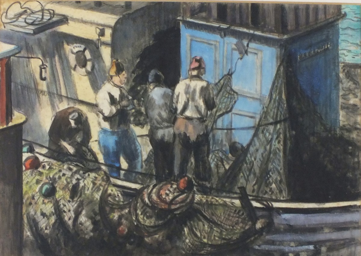 Marjorie Mort (1906-89): Fishermen Sorting the Nets aboard a Trawler