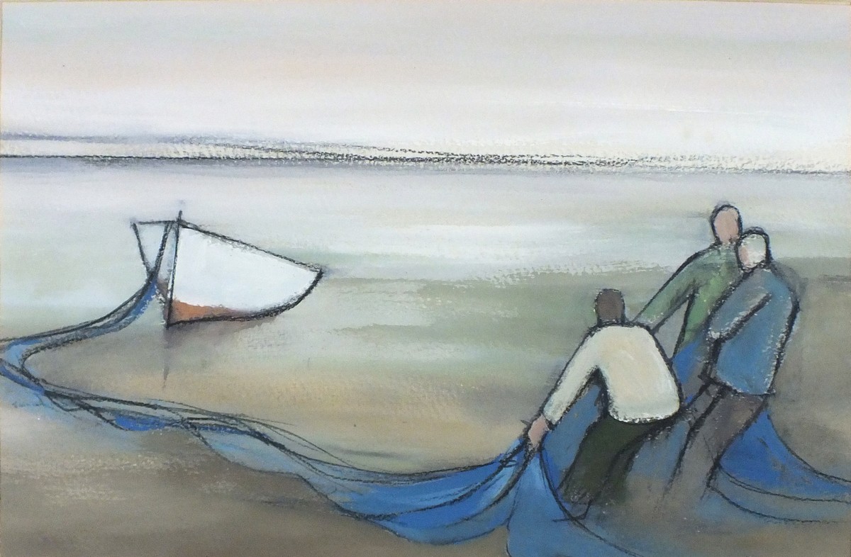 Michael Praed (1941-): Three Fishermen with Blue Nets & White Boat (1998)
