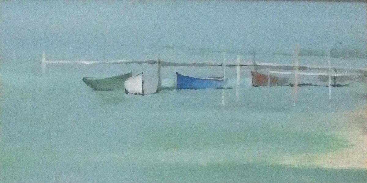 Michael Praed (1941-): Four Boats Beside a Jetty