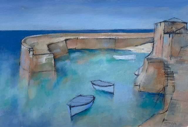 Michael Praed (1941-): Harbour with Three Small Punts