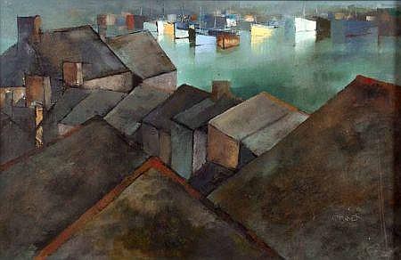 Michael Praed (1941-): A Harbour Scene Viewed Across Rooftops