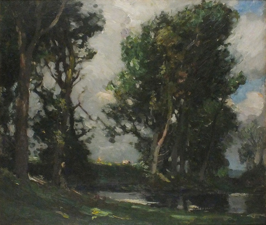 Lamorna Birch (1869-1955): A Breezy Day, Figure beside a Tree-Lined Pond (Undated). Private collection