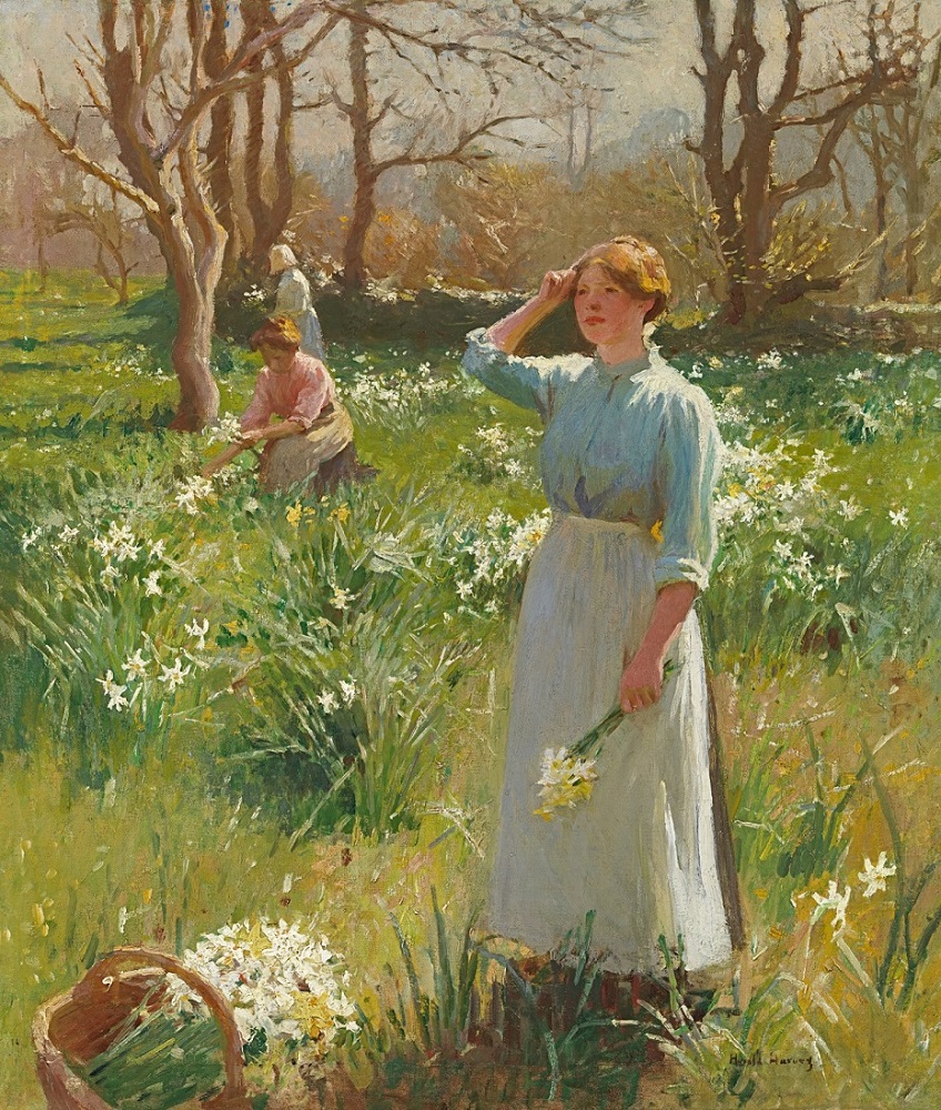 The ensemble is one loosely derived from Bastien-Lepage and adopted to great effect in the orchard and woodland scenes of Henry Herbert La Thangue, in works such as Cutting bracken, 1898, (Laing Art Gallery, Newcastle upon Tyne) and Gathering plums 1901, – one of Harvey’s mentors.,/p>