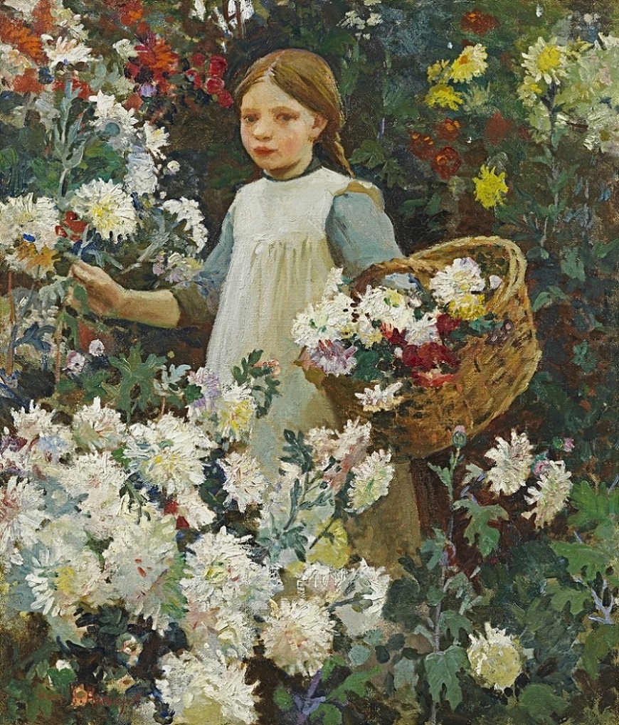 Picking chrysanthemums, painted in 1915, reflects Harvey’s move towards more enclosed, contemplative themes during the First World War. As were other Newlyn painters, including Laura Knight, Harvey was unable to paint landscapes because this was forbidden on grounds of national security. Instead, he sets his solemn young girl in a riot of late-summer blooms which emphasize her own beauty and the fragility of childhood, all the more poignant given the dire international situation. The oblique viewpoint and emphasis on surface decoration echo James Tissot’s painting of his companion Jo Heffernan in a greenhouse picking flowers, Chrysanthemums, c.1874-76 (Sterling and Francine Clark Art Institute, Williamstown, MA), but Tissot’s sensuality is here replaced by innocence. The allusive brio with which Harvey models the chrysanthemums shows his ultimate debt to Impressionism.