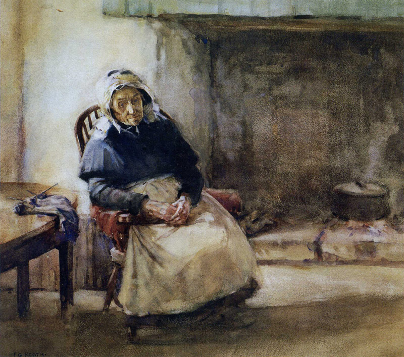 Lily sitting by the hearth in her cottage at Boleigh. This is one of the few watercolours painted by Frank Heath.