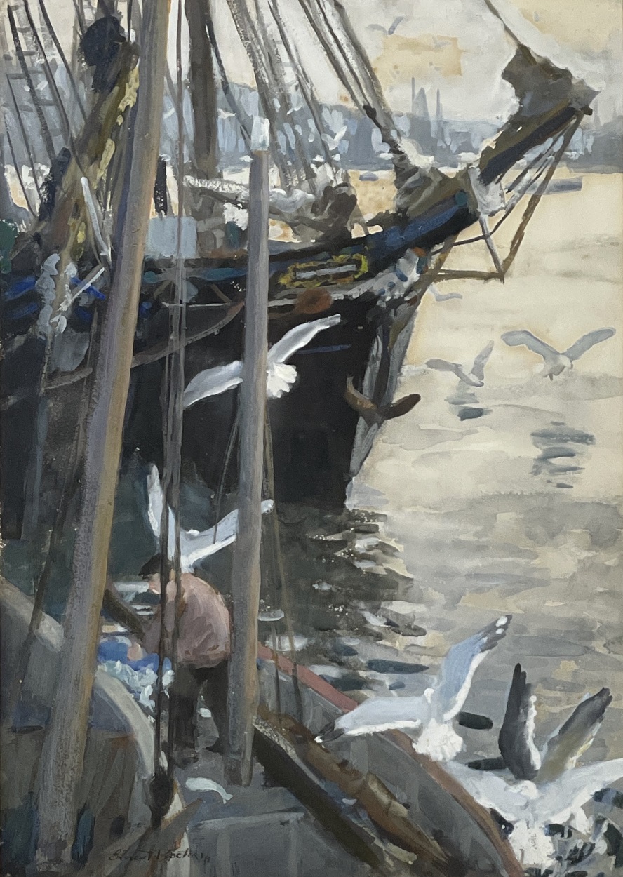 Ernest Procter (1886-1935): A Schooner in Harbour, Newlyn (1914). Private collection