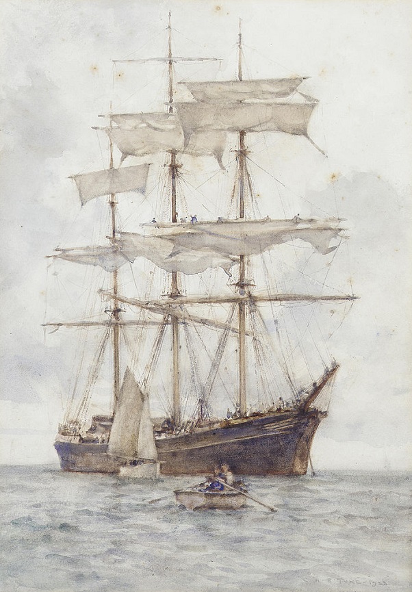 Henry Scott Tuke (1858-1929): A full-rigged three-master making ready to sail (1923). Private collection