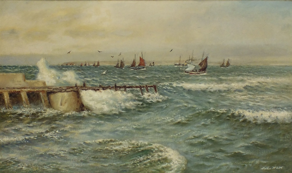 Arthur White (1863-1953): Fishing Fleet Sailing Offshore beyond a Jetty