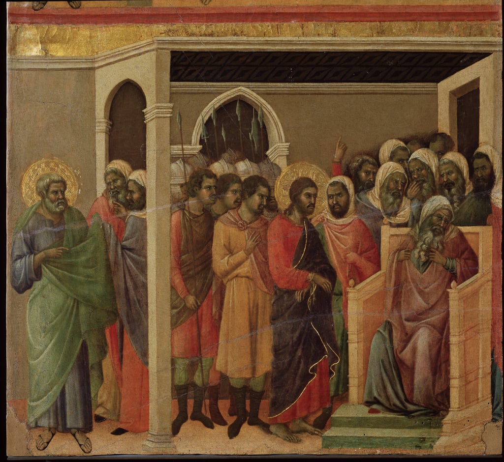 Duccio di Boninsegna (c. 1255–1260–c. 1318–1319): Jesus before Caiaphas (1308-11). Museo dell'Opera Metropolitana del Duomo, Siena