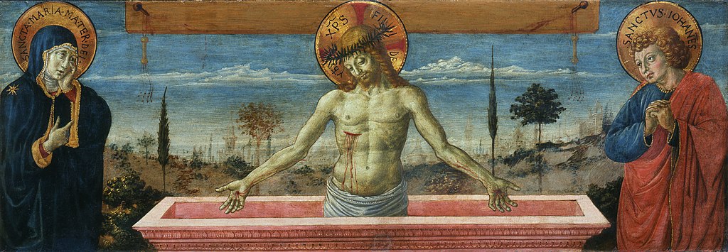 Benozzo Gozzoli (c.1421-97): Christ the Man of Sorrows between the Virgin Mary and St John the Evangelist (c.1450). Pinacoteca di Brera, Milan