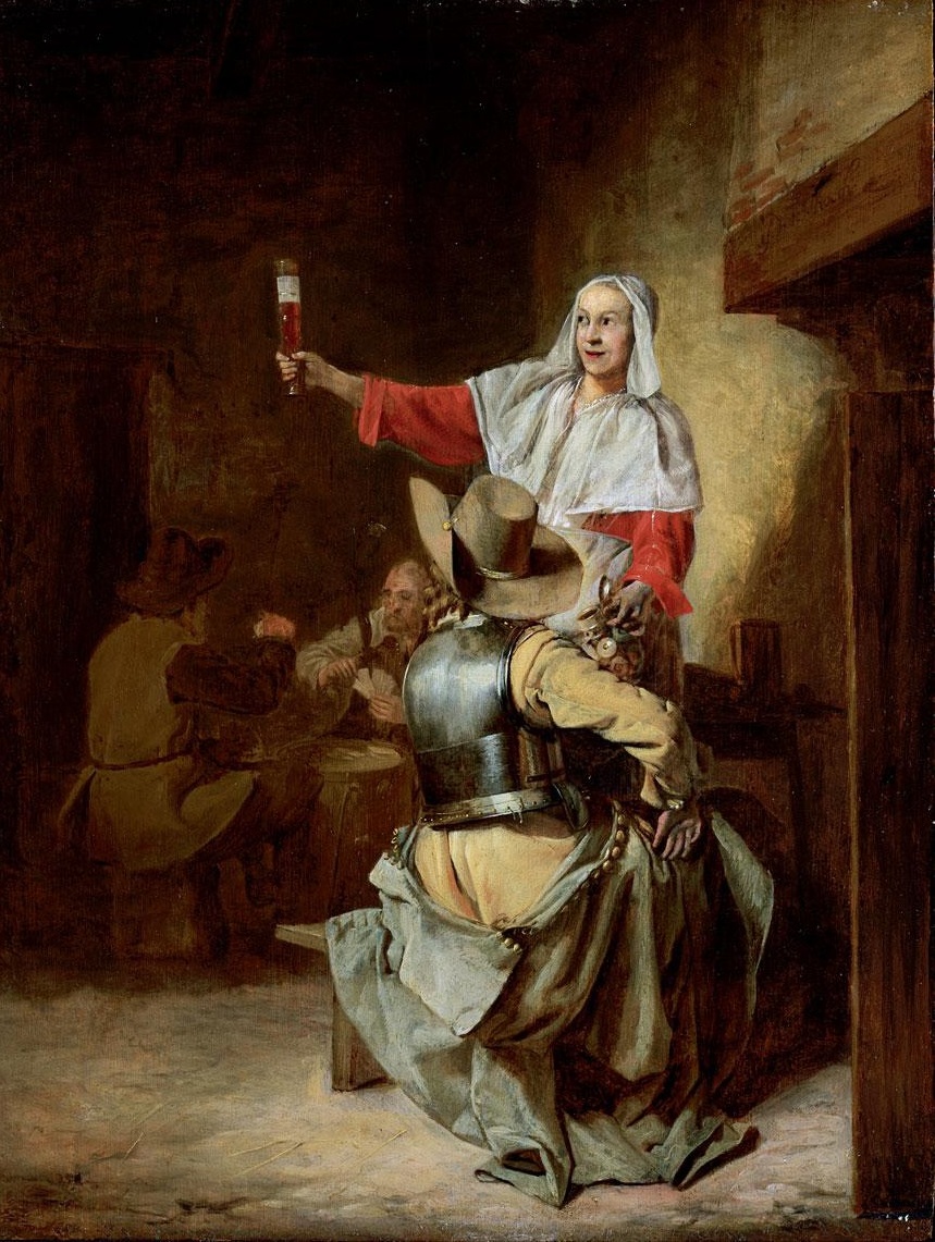 Pieter de Hooch (1629-1684): Soldier, Maid and a Company Playing Cards at an Inn (1652-55). Private collection
