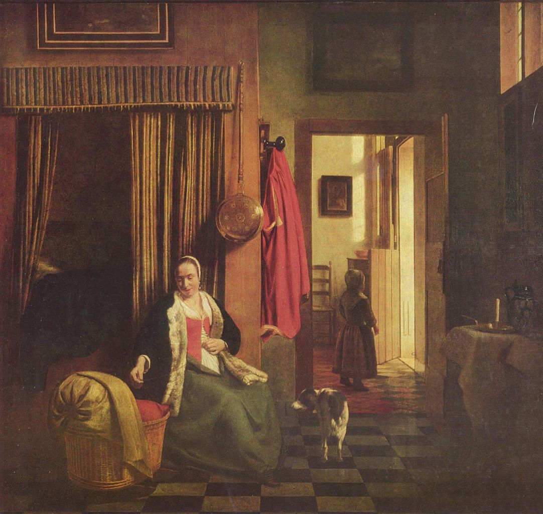 Pieter de Hooch (1629-1684): Mother Lacing Her Bodice beside a Cradle (1661). Gemäldegalerie, Berlin
