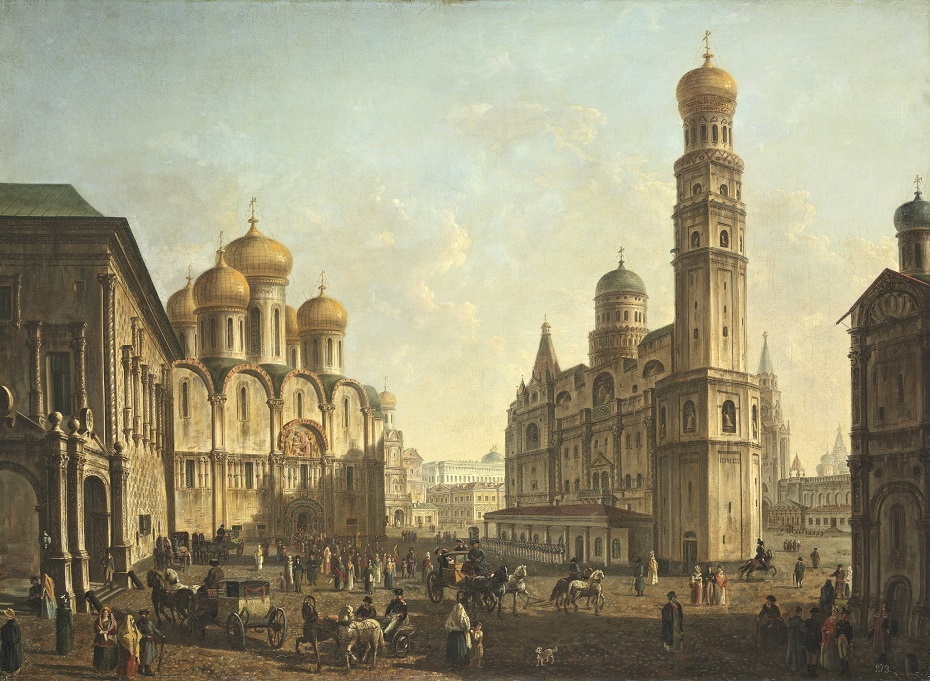 In 1800, on the command of Paul I, the Council for the Academy of Arts commissioned Alexeev to ‘capture various aspects’ of Moscow which is where, with his assistants he spent the next two years of his life. In this painting the artist paints Cathedral Square, the most important and oldest part of the Kremlin. Its unique architecture dates back to the beginning of the 16th century. In the centre of the composition stands the Assumption Cathedral, the most important State Church in Moscow where all Russian Royalty were married. Behind the Cathedral one can see the Church of the Twelve Apostles, the Monastery of Miracles and the Senate Building. On the right is the complex of Ivan the Great Bell Towers which was built over a period of over one hundred years. Directly behind the bell towers is the Spassky Cathedral and next to it is the Tsar’s Tower. Behind the Kremlin wall one can see top of the Pokrovsky Cathedral (St. Basils Cathedral). In the foreground on the left is the Palace of Facets with its Red porch – a fragment of the western facade of the Archangel Cathedral.