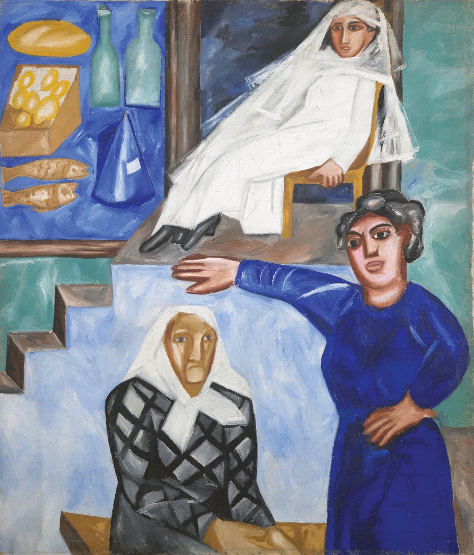 Marina Tsvetaeva’s essay about Goncharova helps to understand the painting Jewish Women. It mentions the poet’s impression of her first trip to the south: “Dry south, not maritime but pre- maritime. Steppe. Dniester. Bakhchi. Fragrant herbs. Sage, wormwood, thyme”. In the mind of the artist, who was also in love with the Crimean steppe, that world “gave birth” to the characters that appear in the painting Jewish Women: “Types of Jews so unlike ours, more Spanish looking. I recognised them later when looking at my Spanish women”. The painting has is a hint of a genre scene. The showcase of a small Jewish shop, where a sugar loaf head, pastries, fish and oil bottles stand next to each other, is a background for three female ages, three incarnations. The most fragile one, seated on a chair in front of the shop, is a bride wrapped in white. The other two figures “project” her future life: a mature, robust, beautiful woman and an old woman with a face that seems to be carved out of wood. The painting has come a long and difficult way, like the artist’s life itself and our country’s history. In 1915, Natalia Goncharova and Mikhail Larionov, her husband, friend and associate at work, were invited by Sergei Diaghilev and Igor Stravinsky to Switzerland to work on the Ballets Russes. Leaving Russia, they did not imagine they would stay abroad forever. Later, their friends sent them to Paris everything that had been created during the “Russian period”. After the artists passed away, their very rich legacy was returned to Moscow according to their will and through the efforts of A.K. Tomilina-Larionova, Mikhail Larionov’s second wife.