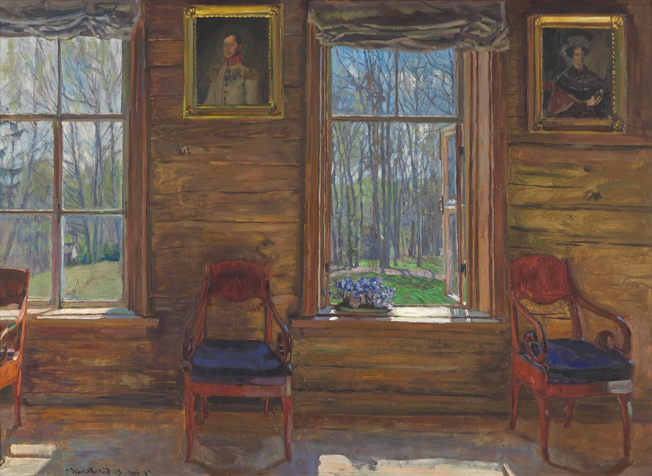 The canvas continues the Romantic traditions of interior painting, first of all those of the Venetsianov school. This sun-lit interior was painted under the influence of Impressionism, the Russian version of which has a typical lyrical note. Impressionism influences the way the life of things is portrayed. The greater part of the composition is claimed by windows, with the room space laid open to the outer world. Spring nature triumphs outside the windows, with its new foliage warming the heart and the sky ablaze with azure. The windows are like a pair of eyes watching the world that is waking up. The posy of snowdrops on the window sill seems to be a fragment of the blue sky. The old manor walls come to life, become warm, luminous as if soaked in the sun. The closed window projects a different mood. Seen through its pane dim with time, the landscape seems to be gloomy, to have lost its colours. The portraits and Empire-style chairs introduce a hint of nostalgic memories of the life that once filled the house but now is forever gone.